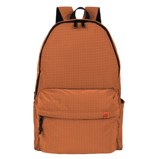 軽さと表情がポイントのデイリーリュック。 リュックのショルダーの片方の下部を外して背面のポケットに収納し片側のショルダーで斜め掛けで着用するのもオススメです。 フロントポケットをひっくり返して収納可能なパッカブル仕様。 生地も特徴的でシボ感のあるウォッシャーナイロンリップストップを採用、格子ステッチが配色になっています。